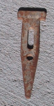 Interestingly, it looks like it's been in the dirt for a very long time, like many of the bent nails. I can only assume that the fill dirt they brought in was dug up from somebody else's construction site, and we've inherited as many rusty nails (and other odd things, including half a roller skate) as our project generated over the past ten months since we broke ground. But in truth, the thing is mysterious. It's almost exactly 4" long, by and inch and change wide at its widest point. The legend "ELL" or "ELLI" is embossed on it. I'm sure it's intended to be driven into something with a really big hammer. Is it a climber's piton? Anybody got any ideas? |