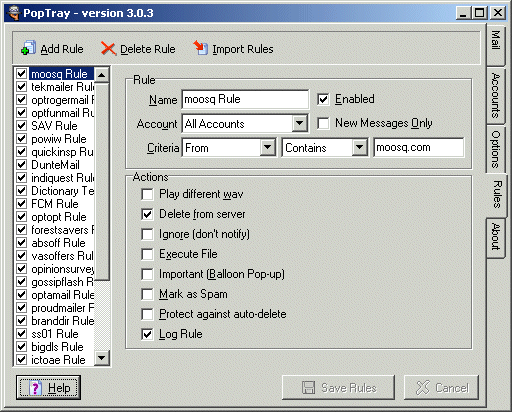 POPTray sits in the Windows taskbar tray, and every so often (you set the interval; mine is set at one minute) it goes up to your POP server and looks at the messages waiting for your regular email client. You can set rules based on several parameters, primarily the sender address. If POPTray sees a message from a specified sender, it will pop up a balloon message to let you know, or (if you enable it) sound an audio announcement. This is useful if you want to get mail from certain people as soon as it arrives, but don't want to be fooling with your email client every ten minutes. Once POPTray sounds off, you can launch your regular mail client, or even take a peek at the message in POPTray's own window. Basically, you can read your email only twice a day, and still get those priority messages as soon as they arrive. POPTray's other use is to delete messages from known spammers before you waste time downloading them to your mail client's inbox. Eyeballing my spam indicated that a relatively small number of domains generated a great deal of spam. I often get as many as thirty spams a day from OptinRealBig megaspammer moosq.com alone. By setting up only about 25 rules, I eliminate about 40% of my spam before I ever download mail, which makes the downloads go a lot more quickly. POPTray is a great deal like what I had envisioned for my Aardmail email robot. Since I have the source, I intend to look into adding a client-side black hole feature. I have bits and pieces of the code already done and tested; how hard could it be to pull it all together? (Don't answer that...) |