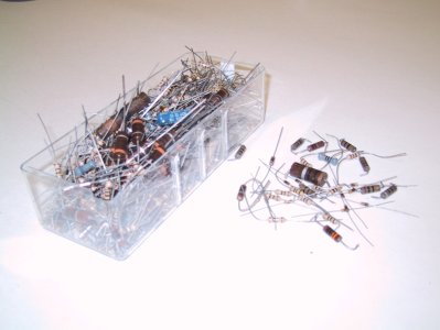 Back in 1992, I bought a rotating parts tower from Turnkey to bring my chaotic electronics parts storage system into some kind of order. A parts tower is a rotating stack of 12 multibin cabinets, and although it took me a couple of months to get my small parts out of milk jugs and cardboard boxes (my larger parts like tube sockets and relays are still in milk jugs) it made a tremendous difference. Moving it, however, was a pain. I took each little bin (there are over 200) and dumped its contents into a sandwich-sized Glad Bag. For partially full bins, the bagged parts would go back into the bin. For full bins, parts plus bag would not fit, and so I left the bin empty and put the bagged parts into a separate cardboard box. Once the bins were all bagged, I took the tower apart and stored it all (with abundant newspaper for padding) in two large boxes, where it sat for well over a year. As time allows (it's a low-priority project, at least for now) I've been un-bagging my parts and getting the parts tower back into full working order. The problem lies with those full bins. The bagged parts wouldn't fit back into the bins—so why would I assume that after dumping the parts back into the bins, the bins would fit back in their cabinets? I had originally placed the resistors into the bins one or two at a time, as I sorted them by value. As a chaotic wad, the resistors are about 30% larger than they were when they were all neatly placed, with leads in alignment and scarcely enough space between them for an SMT diode. Rattling and shaking the bins made little difference. I may have to dump them all out on the counter and put them back in as they went in to begin with: one at a time. Uggh. |