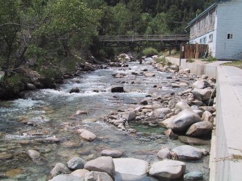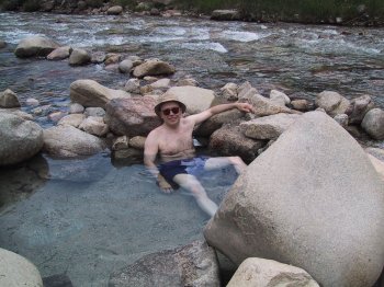 We didn't stay at the resort, which is small-town funky but quite cheap ($70-$90 a night) for the facilities, which include a 300-foot water slide fed with warm springs water. For $8 you get a day pass to the hot springs, and at right you can see me soaking my driving-sore butt in Chalk Creek. What they've done is carefully arranged the boulders on the edge of the creek, so that the 140° springs water mixes with the 59° creek water in various proportions, providing very natural-looking 2-person pools with water from the high 80s to the low 100s. The pool shown here was at about 96°, which I consider about perfect for extended soaking.