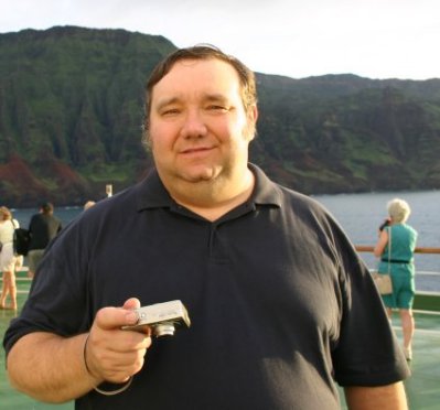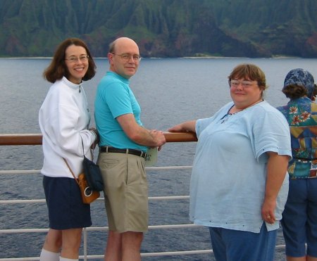 Anyway, at the request of reader Terry Dullmaier, I'm posting a couple of photos of our intrepid group who haven't been much in evidence in my postings since I began our cruise series here. First of all, here are Carol, myself, and my sister Gretchen, standing on deck watching the Na Pali Coast go by several afternoons ago, while we were running past Kauai.