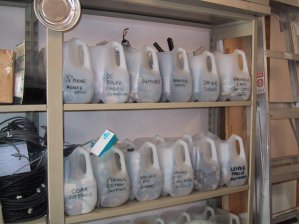I was depressed for awhile, but then it occurred to me that gallon jugs, like that other stuff, happen on a regular basis, especially for people who still drink milk and put windshield washer fluid in the car themselves. So the jugs are staying here, and the parts are all going into neatly-knotted grocery bags and packed like brisling sardines in book boxes that I've been cadging from the local Barnes & Noble since last fall. Little by little, the garage is vanishing into book boxes. We completely fill the (huge) robotrash can every week. And still the pile is there. Nothing like having to move your stuff to remind you just how much of it there actually is. |