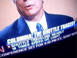 For as long as there's been credible science fiction about space travel, the great danger has always been burning up on re-entry. At 7:30 this morning, alerted by an extremely short e-mail from Frank Glover (subject header: "Not good") I stumbled downstairs and turned on the little TV in the kitchen just in time to see SF's worst nightmare coming true. I spent the rest of the day mutely piling stuff into boxes, and when there was a decision to be made as to whether some artifact should be kept or pitched, it was a whole lot easier for me to say pitch than keep. I got a lot of goofy email today, from people telling me that Columbia streaked incandescently over Palestine, Texas, and others remarked on how it passed right over Roswell, and that Art Bell's show might be something to tune in to, just to witness the paranoiafest that is certainly only beginning. Screw that. It's time for a new way to get to space. Our whole space program is founded on Seventies technology, as I've joked a time or two. It's not funny anymore. |
