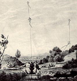 We've come a long, long way since Hi-Flier. Wired has a story in their current hardcopy issue (not yet posted) on kitesurfing, a new "extreme" sport in which a surfer on a short board uses a good sized two-line steerable kite to haul around the water and occasionally (or, as is increasingly the case, constantly) leaping up into the air to do tricks, up to and including hanging upside down for long seconds. It's gotten popular enough so that fights have broken out on California beaches between conventional surfers and kite-toting interlopers. I haven't watched a lot of kitesurfing aerobatics, but when I was in San Diego about a year ago I followed the sight of the big kites down to where surfers were cautiously tacking around the harbor, much as Ben Franklin (a kite fanatic and one of my patron saints) described using a kite to tow him across a lake while he floated on his back. The kites are huge, some of them fifteen or twenty feet wide, resembling air mattresses. They have an inflatable lead edge to hold shape in the wind (a kite without such a skeleton can unpredictably collapse when the wind changes) and are furiously strong pullers in a brisk ocean breeze. I recall building a six-foot double-bow kite when I was in college that could support my entire weight as I leaned back with the reel in both handsimagining the yank power of a twenty footer makes me gasp. There have been injuries and even deaths in kitesurfing, mostly due to the sheer power of large kites in strong wind: One woman died after she leapt into the air from a harbor, allowing the kite to rise just enough to catch a powerful cross-draft that carried her against an oceanside building and literally tossed her through a floor-to-ceiling glass window. Yikes; I let a kite pull me across the Edison School field in my little red wagon once and that was scary enough.