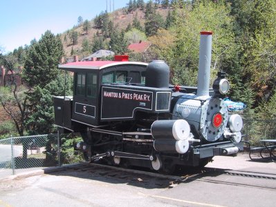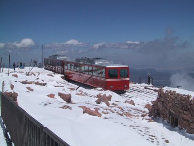 The Cog Railway is over 100 years old, which is remarkable enough: The thought of putting a railroad right up the side of one of the continent's most significant mountains is intimidating enough even today. In the 1890's they used these very odd "sloper" steam locos (photo below; this one still works and runs up the mountain every so often!) which were built at the average angle the railway used up the mountain (somewhat surprisingly, only about 20%) to keep the water in the boiler more or less level as the loco sat on the track. A "cog railway" if you're not familiar with the term, is a