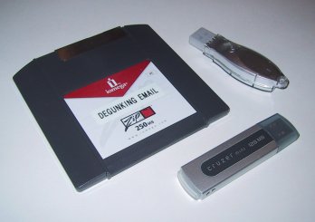 I've used removable media in my writing since 1985, when I bought a dual 10 MB "cateferia tray" Bernoulli Box system for way too much money, and used it daily until 1991, even though it ticked like a bomb all the time it was powered up. Over the years I've used Bournoullis, SyQuests, and most recently Zip disks. The 100 MB Zips were wonderfulI think one went bad in all the time I used them. The Zip 250s, by contrast, are about one for two, if you can believe that: Half of the ones I've used have eventually gone bad. Ouch. I need the room. Part of the work of doing my books is proofing layouts, which come down to me as very large PDFs. A Zip 100 won't hold a full book, including its layouts, so I needed to go to something bigger. 250 MB is big enough (barely) but I need better reliability than I've been getting. I'm pretty anal about backups of things I work hard on, so I've never lost anything crucial when a Zip 250 went bad. Still, that's not a record I'm willing to live with if there's anything better out there.