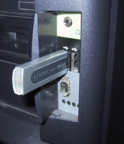 The end of the Cruzer Mini lights up when it's inserted and working, and flickers when you're reading or writing it. I wish there were a recessed USB port so it didn't stick out quite so far. I keep fearing that I'll hook it on something going past and scrag both it and the port it lives in. Still, the first month has gone without a hitch. Its access time isn't anything close to a fast hard drive, but it's about as fast as a Zip disk, which for writing and drawing with Visio is more than fast enough. After each session, I back it up to a folder on my server downstairs using FolderMatch, a $30 file-sync utility. I like FolderMatch so far, though it does a lot more than sync folders and I freely admit I haven't explored it fully. The system's worked smooth as sink since mid-April, and if anything changes I'll let you know. What pleases me most is that we seem to be approaching a watershed event here: The end of moving parts in removable media. I've been predicting that in my near-future SF for thirty years now. Nice to see that it's finally coming true. |