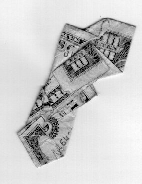 Not long ago, I went too long without cashing a check, and finally had the occasion of pulling the very last bill out of the bottom of my pocket. It was a remarkably shaped thing indeed, a $10 bill that had spent time in the arms of the Muse, and emerged as something one might call "wealth art" with something approaching (but not achieving) a straight face. Hell, call it whatever you want to; I call it moneygami. Everything should have a name. If you spot something without a name, give it one quickly, before somebody decides to call it a door closer.