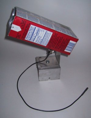 It took maybe 20 minutes, and I did what cardboard mangling had to be done with a Swiss Army knife. After soldering 1.22" of #12 wire into the solder pot of a silver-plated N female connector, I bolted the N connector to the box with 4-40 screws with spiny lock washers under their heads. The spiny lock washers were crucial, since the foil lining of a Tetra Brik is itself covered with a thin plastic film. The body of the N connector must be in electrical contact with the aluminum foil, so I mashed down hard on the four screws to make sure the spines on the lock washers pierced the plastic film and made contact with the foil. Once my ohmmeter indicated a solid connection, it was done. I mounted it on a scrap of aluminum sheet metal and an old heat sink from a Xerox 660 copier, as shown at left. It works well. Not quite as well as a tin-can antenna (see my entry for October 8, 2002) but it's smaller, and it still allows me to connect from my living room coffee table at the full Wi-Fi bit rate of 11 Mbps. Tetra Briks are really a European phenom, but you see them here and there in the US, and if you want to try this, you need the 60 mm X 90 mm X 200 mm size. The performance of a waveguide antenna is tightly linked to its size, and smaller or larger boxes may not be electrically compatible with the 2.4 GHz Wi-Fi frequencies. |