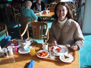 We did another couple of miles on the teak track around the promenade deck, with bright sun on the water and that unfamiliar (to Coloradans, at least) salt smell in the air. We didn't "do" much today, and that was just the point: We walked, we did a short brisk stint on the treadmills in the gym (which required hanging onto the handgrips, something I almost never do) and we hung out with Gretchen, Bill, and Jerry. I miss my little sister, and it never fails to surprise me on spending any laid-back, unstructured time with her how completely similar we grew up to be, even though in childhood I often suspected that our parents had gotten at least one of us (which one was was subject to heated debate) from the gypsies.