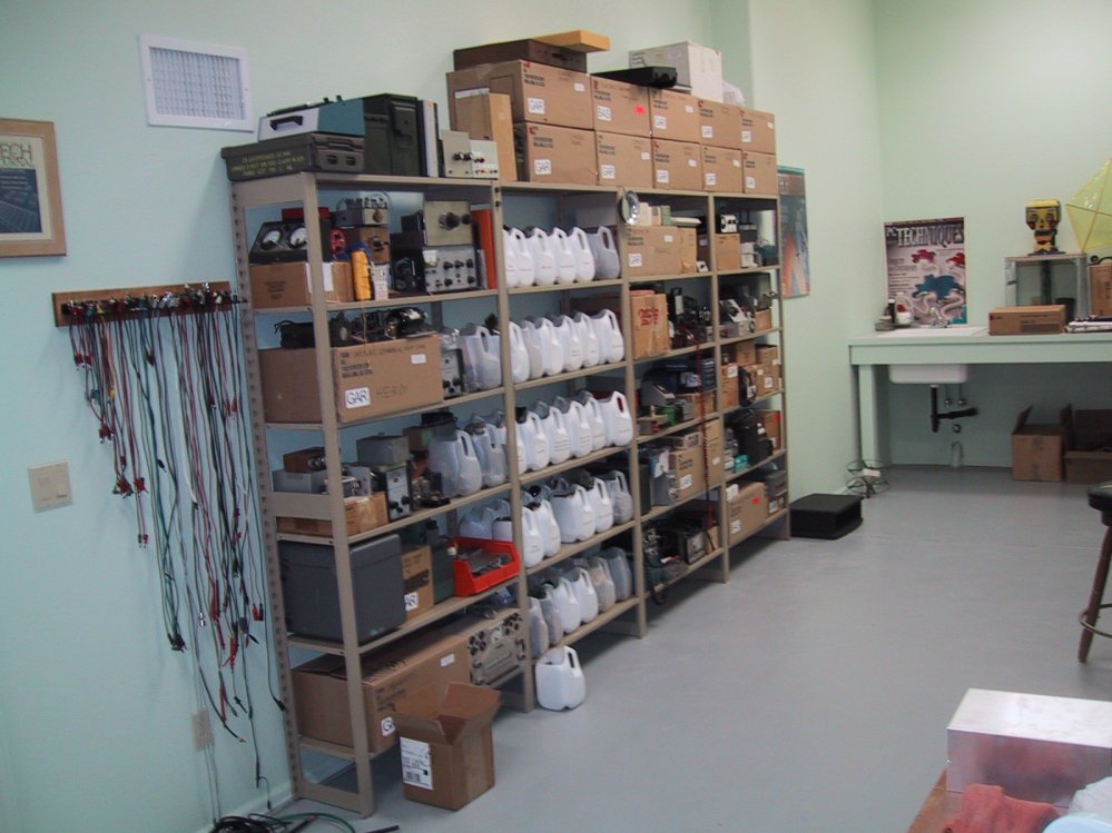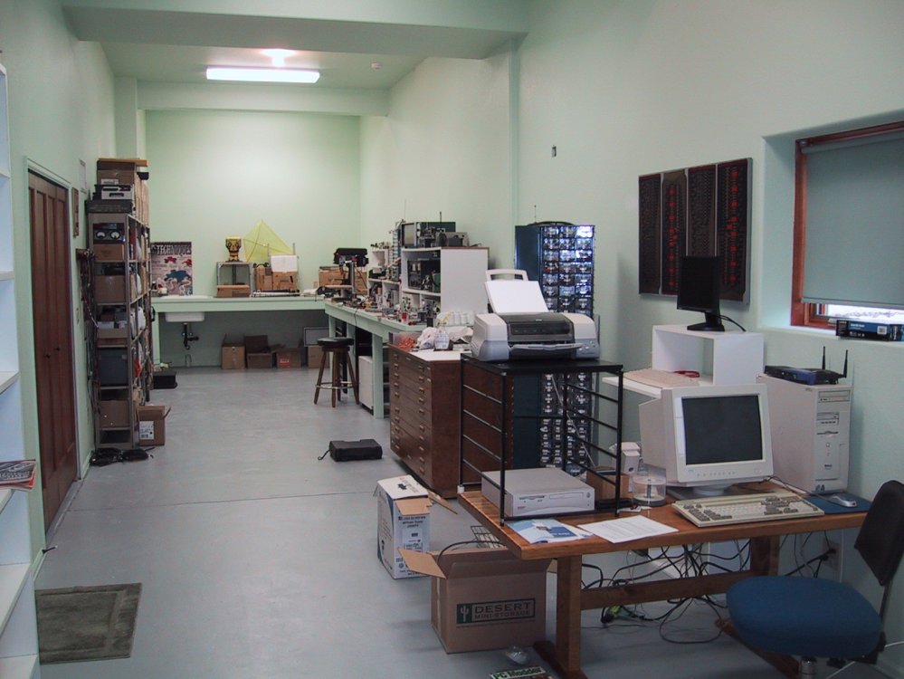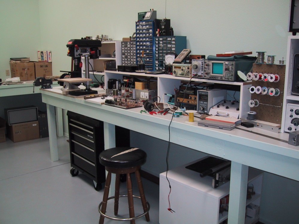 isn't vast empty space At right is the test bench portion of the big bench, where I actually build things, within reach of all my test equipment. The third of the bench off the right end of the photo is where I keep all my classic radios. Further toward the rear of the house is a new-built server shelf and a computer desk, as well as my technical library. Opposite the big bench are my modular steel shelves, containing my parts inventory and other oddments. I'm not quite done yet. There is a little more shelving to be built, and I still need to find a reading chair to park in the corner beside the door to the back deck. There are still some boxes lying around, and I'm trying to figure out a good way to store wire, cable, and headsets, of which I have a few too manybut it's nice to be able to snag a 2000-ohm, 600-ohm, or 8-ohm headset as required. Rather than blow this entry into my largest ever, I'm parking some additional photo links in the left margin. This one has been a long, long time coming...but in a very satisfying way, my tools, my parts, and I have finally come home. |