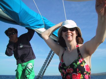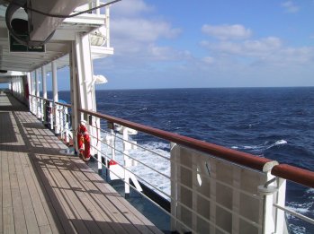 the girls are so pretty Molly has clearly been on a few more cruises than I, who weigh just a hair over 11 stone. The food is so good that it's tough not to overeat, and it was with an iron will that I sat down to breakfast this morning with little more than a bowl of Raisin Bran, a single naked patty of breakfast sausage, and some strawberry-banana yogurt. You can get fed here almost any time of the day or night at no extra charge. Because dinner is so late (8 PM) we typically eat four meals each day, with taco time at 4:30 or so, and hope we don't end up looking like hobbits. Our only significant problem so far is seasickness. On all our previous cruises we were in quiet coastal waters or the peaceful Carribbean, but now we're in the open ocean, and the ship is major boogeying to get to Hawaii in four days. Faster progress means more rock-n-roll, and we're seeing a fair number of people here looking pretty gray. I got queasy last night about 2 ayem, and Carol (God love her!) got dressed and went searching for seasick pills. One of the ship's staff went and found some for her, and I've been in good shape ever since, though walking around is a little trickier than I recall it on our other cruises. Carol's good Navy genes make her oblivious (her father was a Navy man and generally a tough bird) but I seem to be susceptible, and I'll probably be chomping the little chewable meclizine tabs regularly before we get to Hawaii. Today will be pretty quiet. We're all acclimating, and I don't expect to do much more than read a little and maybe take some notes. That's most of what I want in a vacation, so at this point, all is (unsteadily) well. |