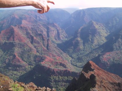 The problem, of course, is that we're using to thinking of islands as little tiny things, like the ones you see in the movies, forgetting that Greenland is an island too. The islands of Hawaii are pretty big as islands go, and there's plenty of room for a few canyons. The photo shown here is a favorite of mine. The instant the shutter clicked, an elderly man leaning on the guardrail beside me decided to reach out and point to something. So (as Carol put it) we captured the sense of Divine Creation: Let there be canyon!