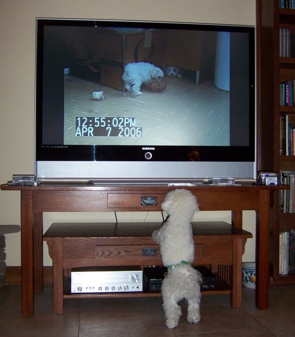 chair and following an imaginary video of Peter playing cat-and-mouse