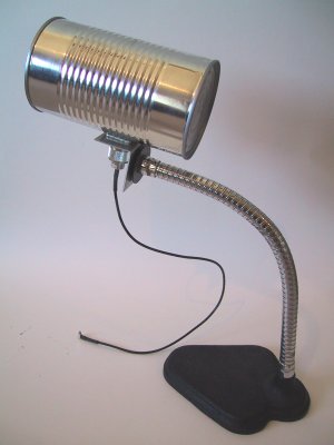The antenna is a 3.375" diameter Hunt's 26.5 oz spaghetti sauce can, drilled to accept a single N connector, into the solder pot of which is placed 1.22" of #10 copper wire. (That's what a quarter wave whip cooks down to at microwave!) The base once belonged to a 50's vintage gooseneck desk lamp that I picked up for $6.95 on eBay. When plugged into the Orinoco Gold card in my laptop, the signal in the livingroom jumps to near-normal levels, and I can pull the full 802.11b bit rate of 11 Mbps without any trouble at all. Mark II is the prettier child of the Mark I prototype, which used a 20-year-old 1-pound coffee can that had been hosting wood screws in the garage since I lived in Rochester, NY. Coffee cans work just as well, and have a lower noise level, probably because they have fewer corrugations to scatter the incoming microwave energy. But the spaghetti sauce can gets the signal where it needs to go, and that's all I would ask of a junkbox gadget like this. It will have a starring role in Jeff Duntemann's Drive-By Wi-Fi Guide. January 2003, Paraglyph Press. Watch for it. |