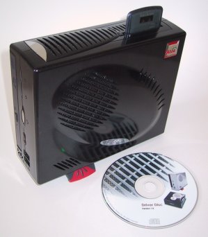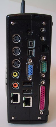 So here it is. The thing is tiny, not even "Bible-sized" unless you have a real small Bible. It's defined primarily by the size of the CD-RW/DVD ROM drive built-in. What I find impressive is that the thing is veritably crusty with I/O. The front panel has two USB ports, an IrDA port (not that anybody cares) plus headphones and mic jacks.
